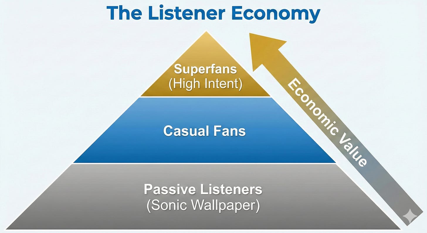 Why does Artist A have 1 million listeners but empty venues? Because “listeners” in 2026 are rarely active participants. They are casualties of the algorithm.