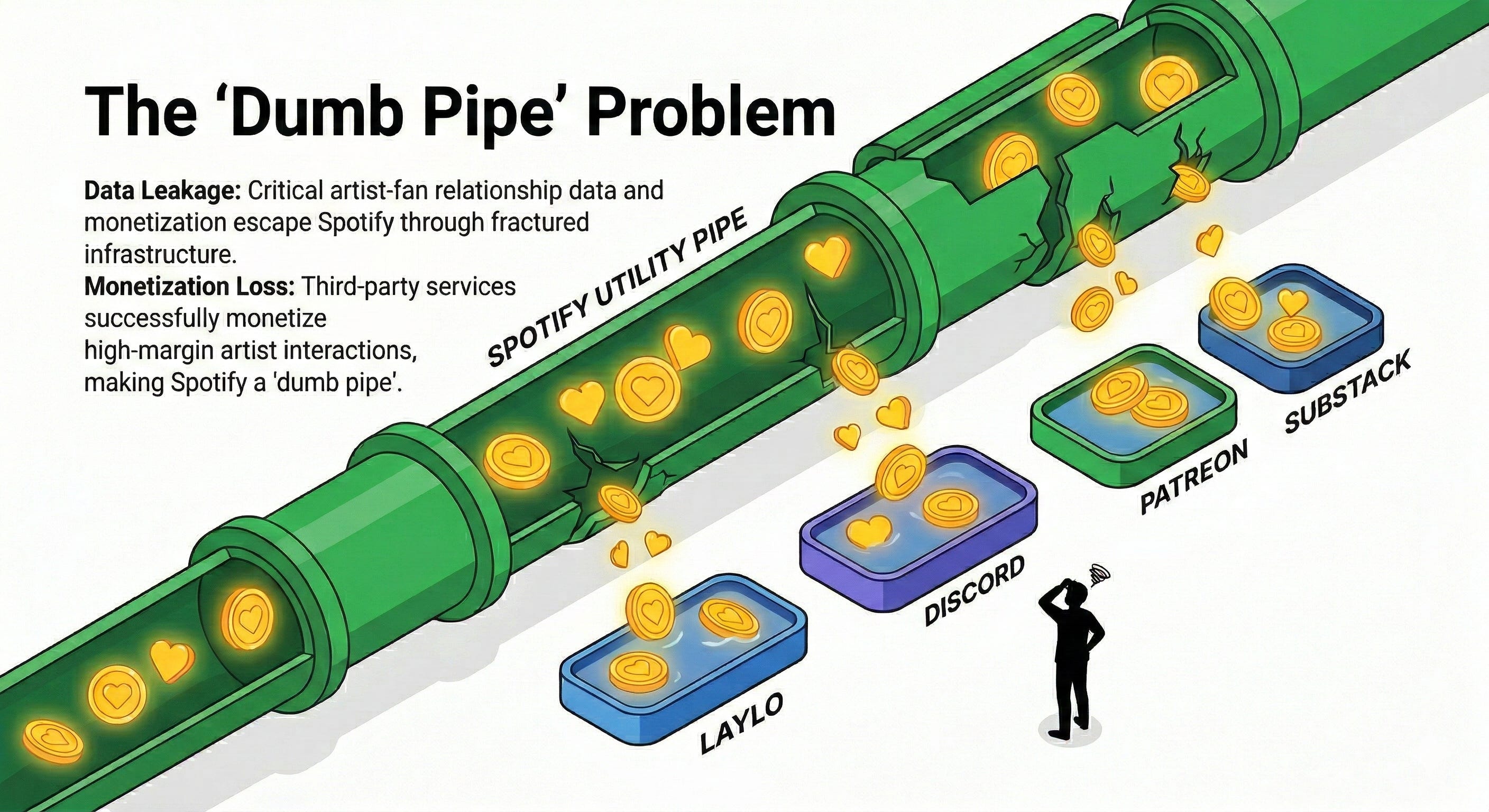 Spotify wants to own the listener. They are terrified that if they give artists the data, the artists will leave. But by gatekeeping the data, they are turning themselves into a "dumb pipe." They are effectively saying: "We will handle the low-margin tap water, but we refuse to let you build a high-margin business here."