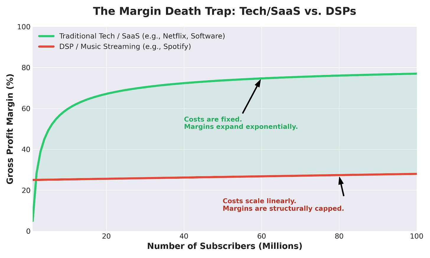 Streaming music operates in reverse. Because DSPs pay out roughly 70% of every dollar earned back to rightsholders (labels and publishers), their costs scale linearly with their user base. Every time a song is streamed, a fraction of a cent leaves the building.
